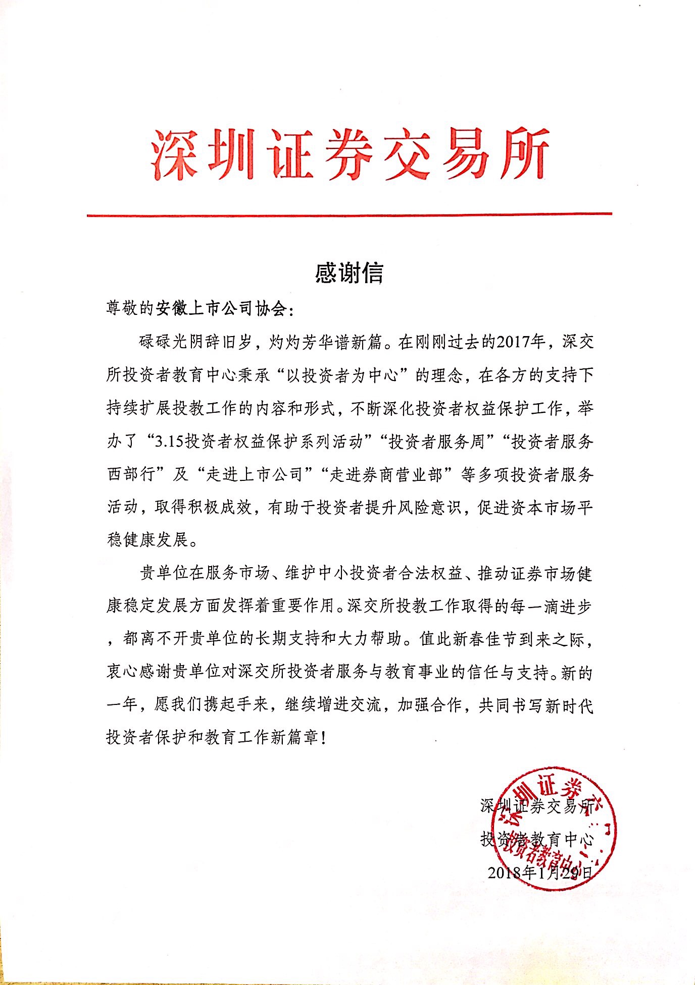 深圳證券交易所投資者教育中心致我會(huì)感謝信