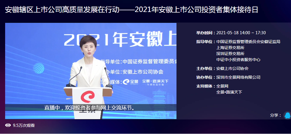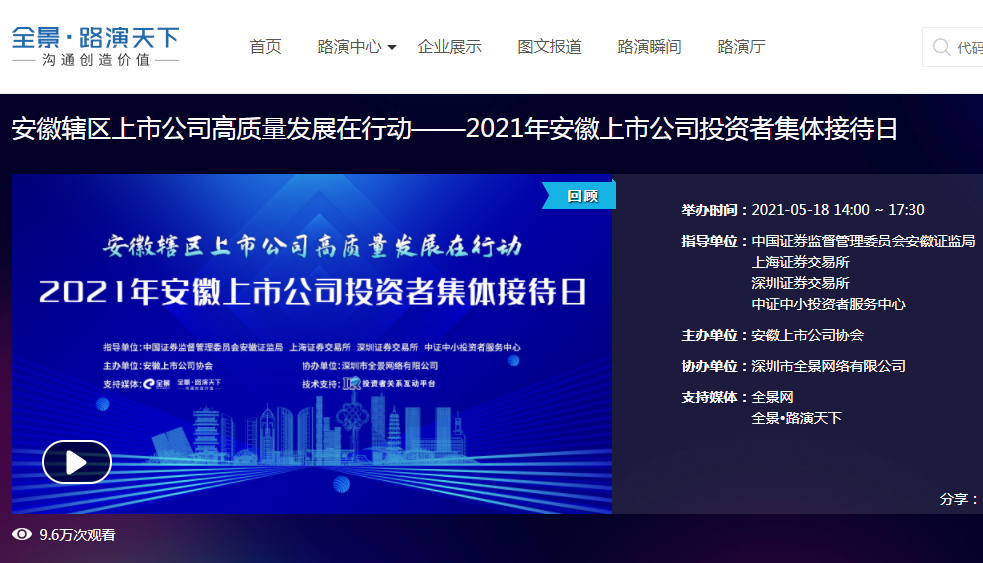 5月18日,我會(huì)主辦的“2021年安徽上市公司投資者集體接待日”活動(dòng)成功舉行,安徽轄區(qū)67家上市公司的近200名董事長(zhǎng)、總經(jīng)理等高管通過(guò)全景網(wǎng)參與了線上活動(dòng),參與、觀看者接近十萬(wàn)人次。
