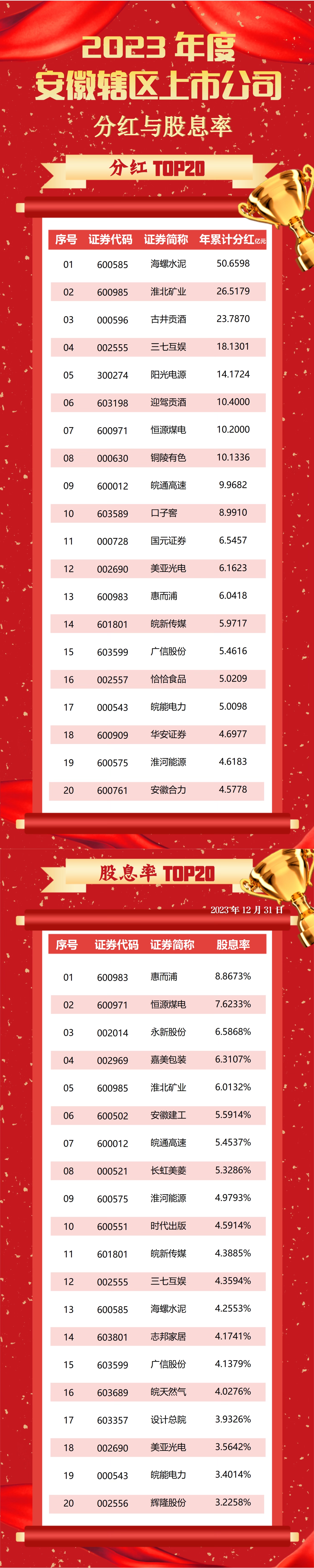 2023年度安徽轄區(qū)上市公司【分紅與股息率】TOP20