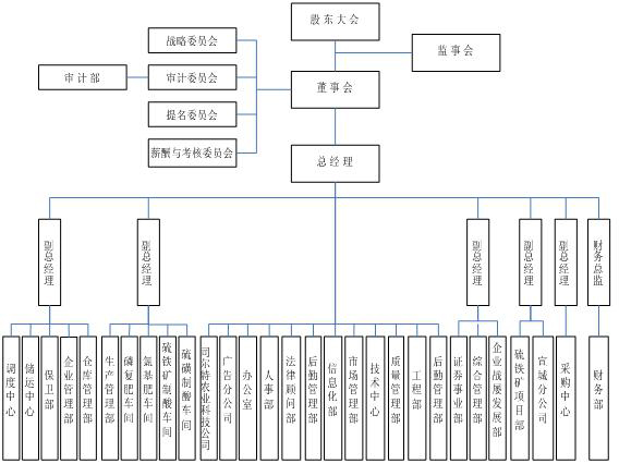 2、組織機(jī)構(gòu)。公司根據(jù)職責(zé)劃分,結(jié)合公司實(shí)際情況,設(shè)立各職能部門(mén),并制定了相應(yīng)的崗位職責(zé)。各職能部門(mén)分工明確、各負(fù)其責(zé),相互協(xié)作、相互牽制、相互監(jiān)督。公司組織機(jī)構(gòu)圖如下: